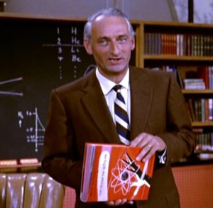 Il s’agissait de montrer que « l’atome est notre ami », et pourtant, Hiroshima avait juste dix ans… La propagande Disney a surtout marqué le monde anglo-saxon, en tout cas, je n’ai pas l’impression que ces documentaires aient souvent été diffusés sur la, puis les chaînes de télé françaises : en tant que téléspectateur assidu depuis le début des années 1960, je n’en ai pas souvenir. Peut-être sur des chaînes belges ou luxembourgeoises ? La glorification de la réaction en chaîne atomique se manifestait aussi ludiquement sous nos climats, mais sous forme de… bandes dessinées. Il suffit de faire un petit effort de mémoire… mais si, vous vous souvenez… dans Objectif Lune, premier volet du diptyque lunaire d’Hergé qui commença à paraître en feuilleton dans l’hebdomadaire « Tintin » dès 1950 ! Wolff, l’adjoint de Tournesol, fait admirer une pile atomique à Tintin et Haddock, tout en expliquant son fonctionnement :