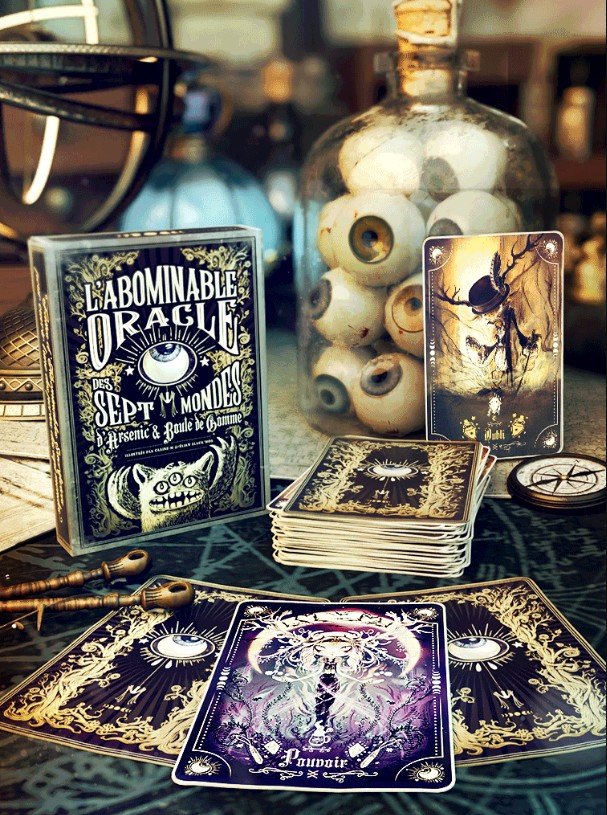 Je dois vous faire un aveux,, je suis assez fan du travail de Carine-M & Élian Black’Mor, auteurs-illustrateurs depuis 20 ans. Ils viennent de lancer un crowdfunding autour de L’Abominable Oracle. C'est un jeu de cartes de 42 arcanes, relié à leurs livres univers, avec un livre livre d'augures.